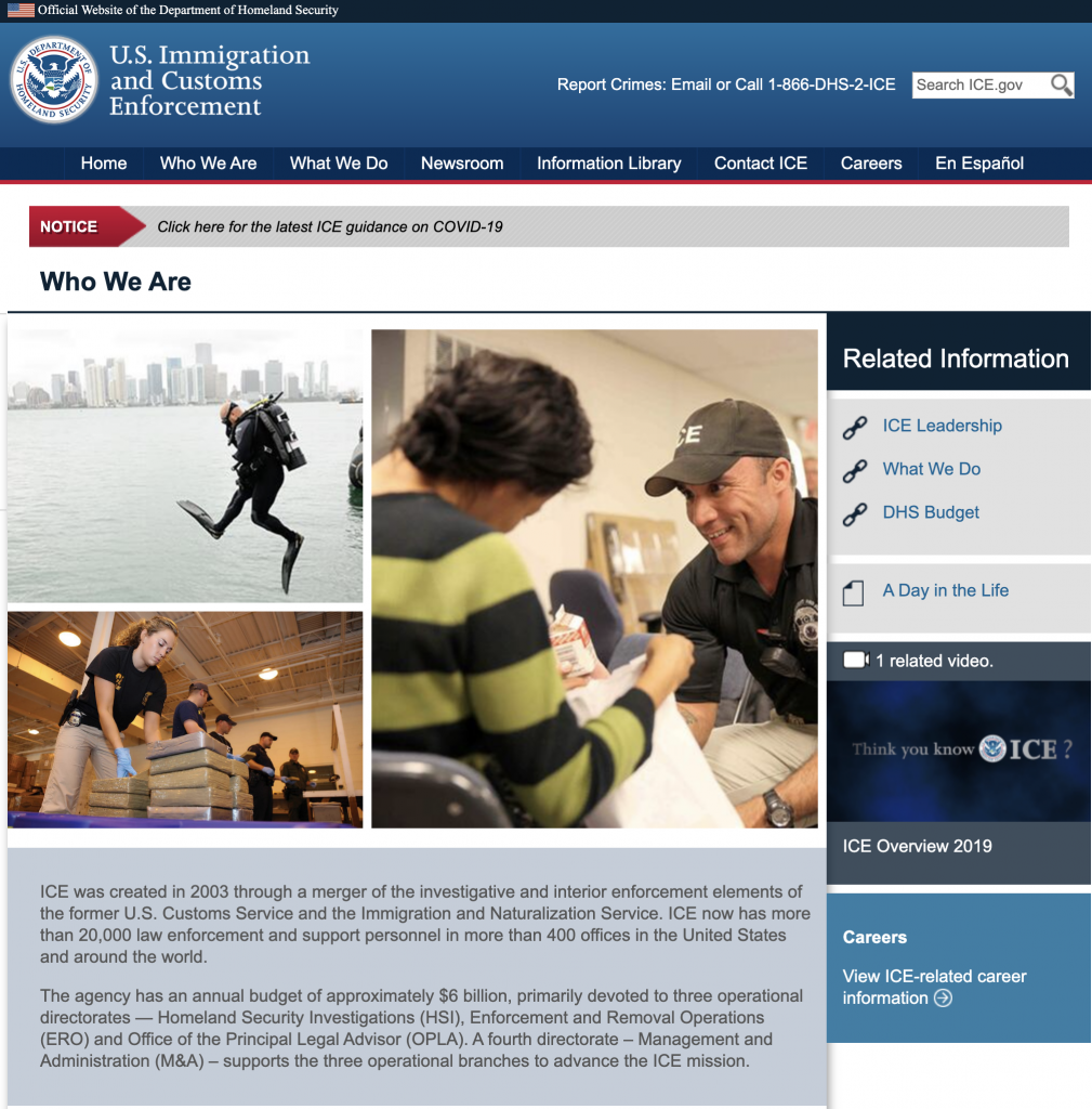 A screenshot of ICE's main website, taken on March 20th, 2020.